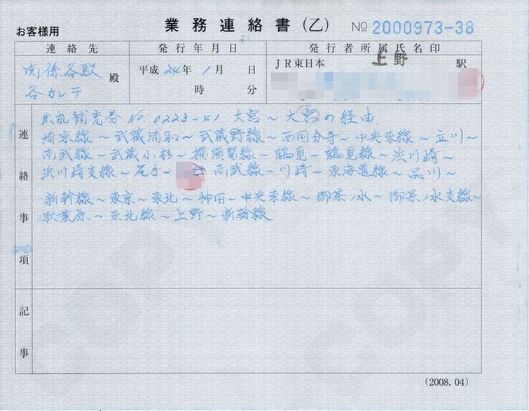 JR東日本の、業務連絡書です。